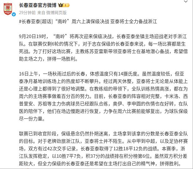 在联赛仅剩6轮的情况下,对于志在保级的长春亚泰来说,每一场比赛都是生死战。为了打好这场比赛,主教练苏亚雷斯带领亚泰将士在基地潜心备战,希望借助主场之力,拼得一场胜利。