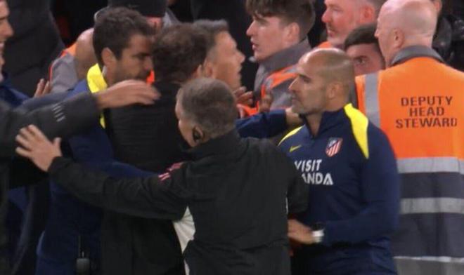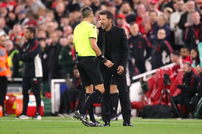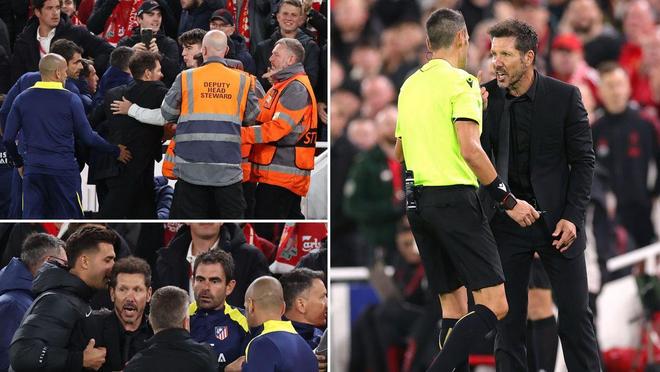 根据现场视频显示,当范戴克完成绝杀的瞬间,西蒙尼正背对看台指挥球员防守。在安菲尔德6万球迷的欢呼声中,他突然转身冲向场边护栏,与一名利物浦球迷发生激烈口角。尽管马竞助教团队试图劝阻,西蒙尼仍情绪激动地用手指向对方,甚至做出挑衅性手势。主裁判毛里齐奥・马里亚尼迅速介入,在与第四官员沟通后,直接向西蒙尼出示红牌。