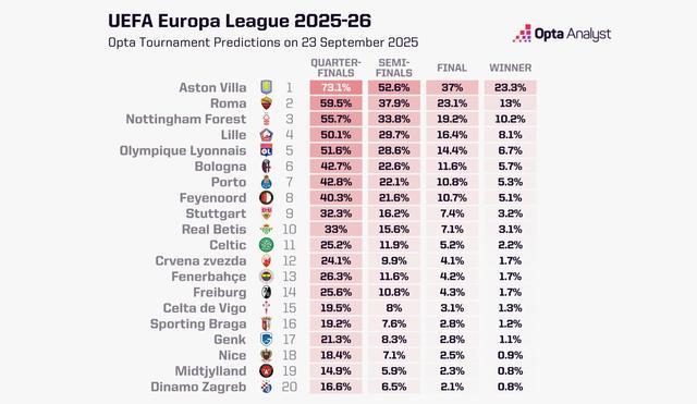 Opta预测25-26赛季欧联杯夺冠概率: