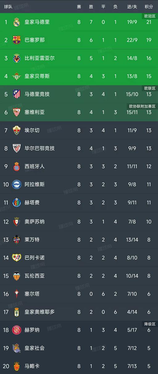 随着巴萨14,马竞11,西甲第8轮最新积分榜如下,皇马重返第1