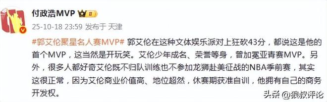 媒体人付政浩发文点评:郭艾伦在这种文体娱乐派对上狂砍43分,都说这是他的首个MVP,这当然是开玩笑。艾伦少年成名、荣誉等身,曾加冕亚青赛MVP。