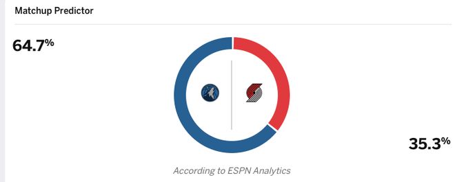 赛前ESPN对本场比赛进行了预测:虽然爱德华兹出战成疑,但森林狼的胜率高达64.7%,而开拓者则只有35.3%。
