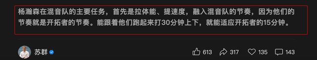 苏群老师说:“杨瀚森在混音队的主要任务,首先是拉体能、提速度,融入混音队的节奏,因为他们的节奏就是开拓者的节奏。能跟着他们跑起来打30分钟上下,就能适应开拓者的15分钟。”