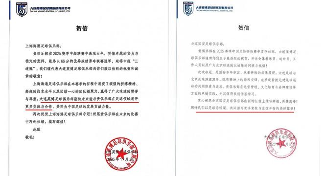 对于上港,贺电中表示希望双方俱乐部未来在足球领域展开更多的合作交流。刘祝润从海港出租到大连英博表现不错,这应该也是大连英博重点提及这点的原因。对于北京国安,贺电中则重点谈及双方的友谊,表示希望双方以足球为桥梁,共同谱写竞技和友谊并存的美好篇章。