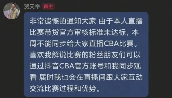 举个最简单的例子,昨晚辽篮名宿贺天举在自己的粉丝群里说,因为他在转播时的带货销量不达标,暂时失去了个人抖音账号直播CBA比赛的资格。