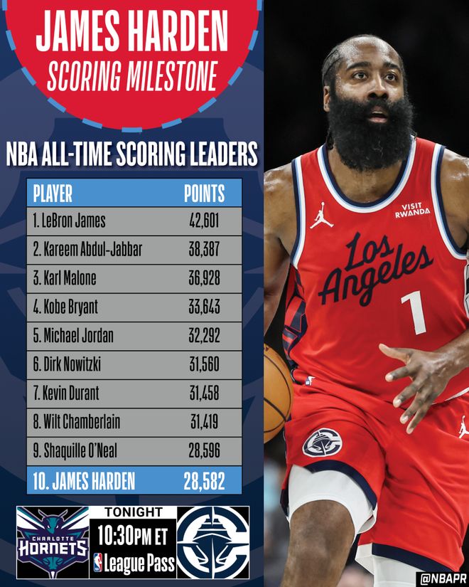 - NBA | 里程碑!哈登生涯总分超奥尼尔升历史第9现役仅少于詹姆斯杜兰特