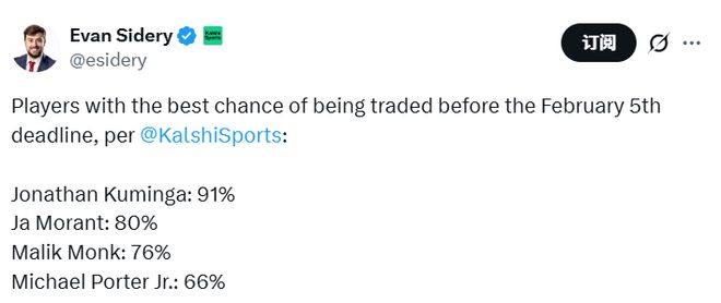 根据Kalshi Sports的数据,库明加的最新交易概率达到91%,高居榜首。他在本赛季早些时候几乎完全跌出了勇士的轮换阵容,自12月19日后便再未登场。如果湖人最终将他列为引援目标,他们将寄望于全新的环境和更多的出场时间,能帮助库明加在其NBA生涯第五个赛季的下半程找回状态、迎来反弹。